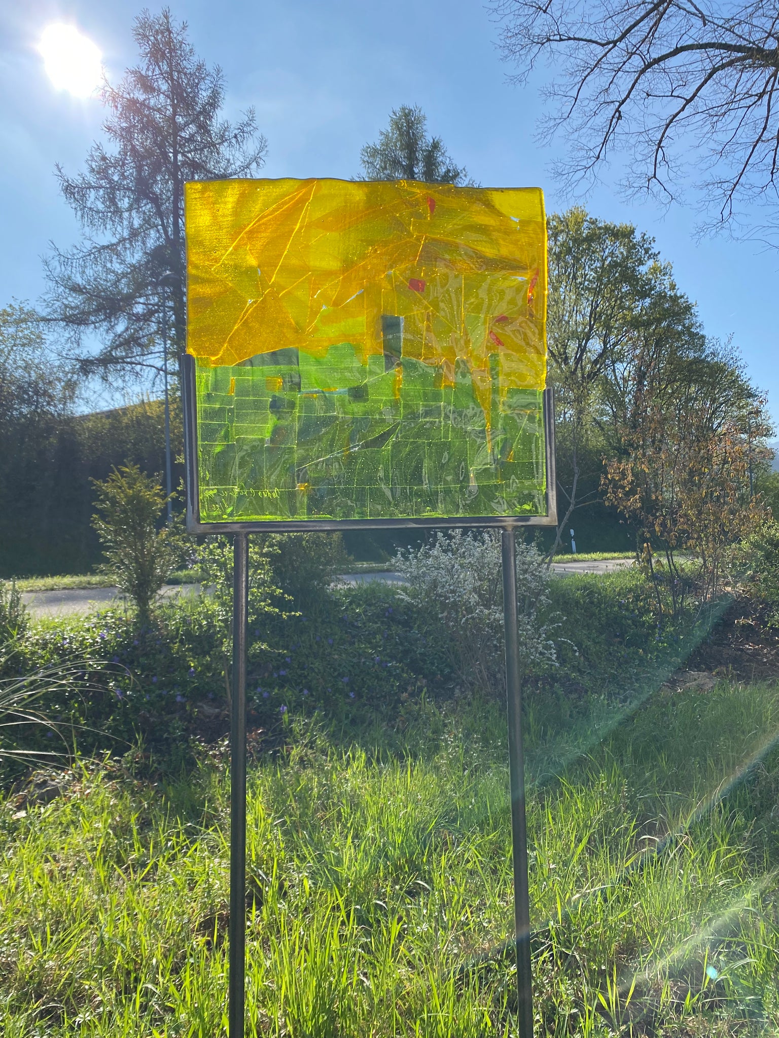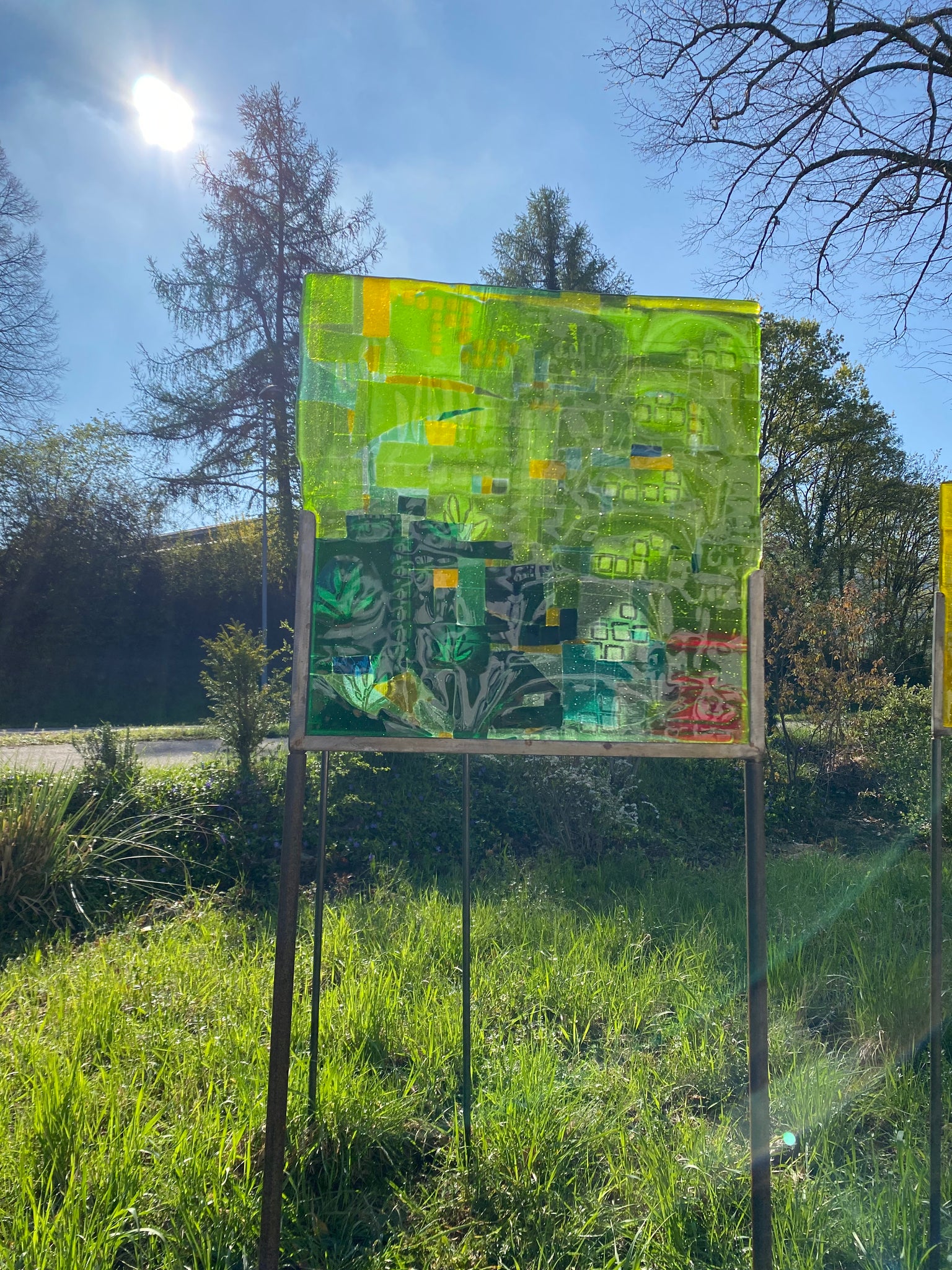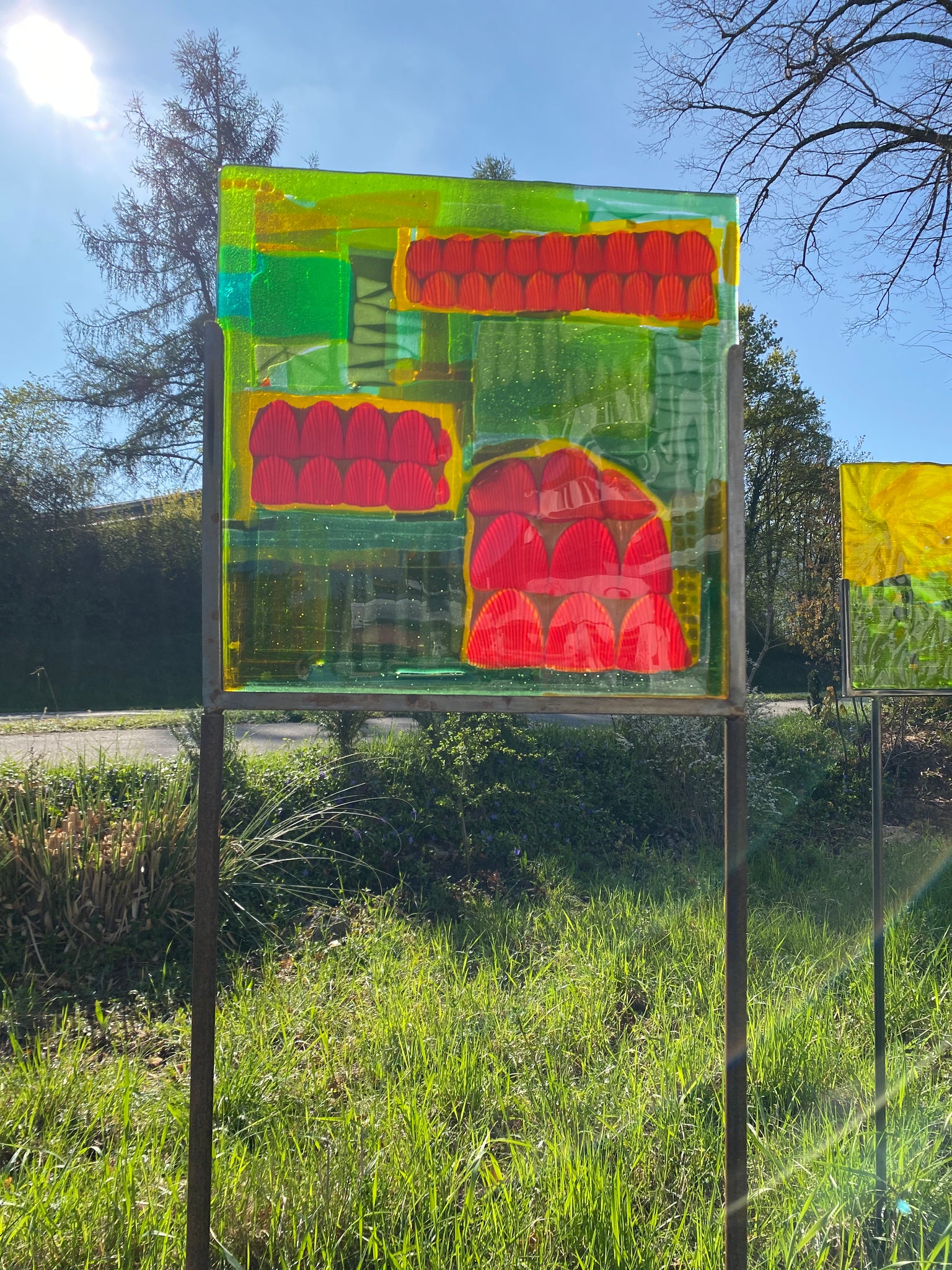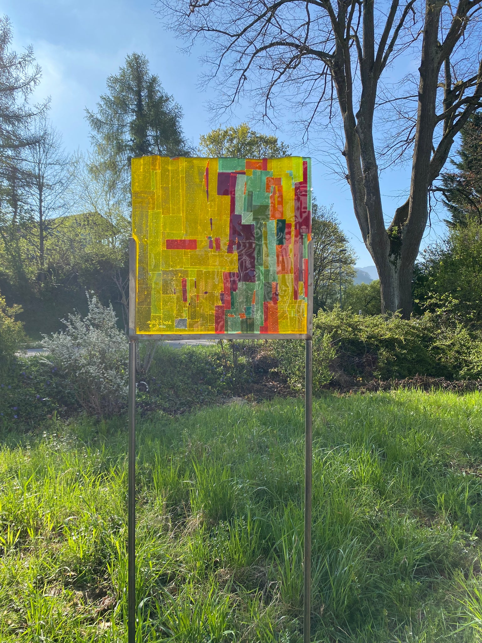 Glasscheiben, flach, quadratisch in Metallschiene verklebt, frostbeständig, wird auf zusammesteckbaren Metallröhren geliefert.
